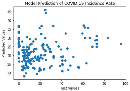 A linear regression machine learning model [22,26] was run on the data set. By applying Equation (1), the model coefficients were computed. The values of model coefficients B1, B2, and B0 are 0.92, −1.30, and 55.64, respectively. The model performance evaluation metric values of R2, MAE, MSE, and RMSE are 0.053, 15.25, 457.04, and 21.38, respectively. The linear model results are summarized in Table 4. A scatter plot of test values vs. predicted values over Mississippi 22 January 2020 to 4 August 2021 is shown in Figure 4.