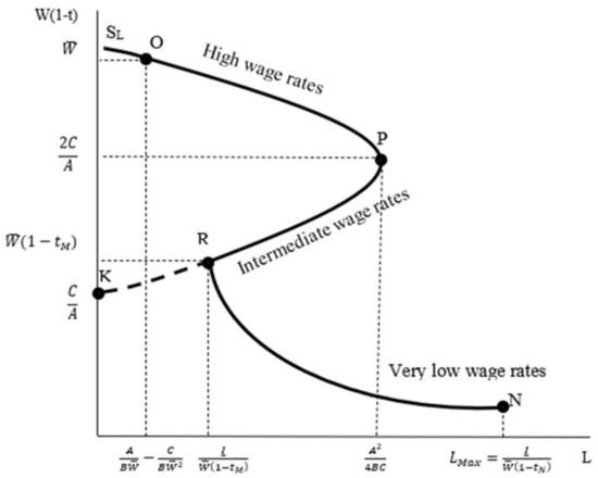 Based on specific utility functions that include a positive income effect on consumption and leisure, those works show ranges where an increase in the net wage rate increases the labor supply, since the substitution effect is dominant. However, as the wage rate is high enough, the supply of labor is negatively affected, due to the dominancy of the income effect on leisure. This leads to the backward-bending labor supply curve (Figure 1). However, at a significantly low wage rate in the economic and social environment, it may occur that a further reduction in the wage rate forces the worker to work more. This leads to another turning point of the labor supply, such that the labor supply curve has an inverted S-shape. As a result of this shape of the labor supply, we depart from the classical one peak point Laffer curve, as shown by Fève [27].