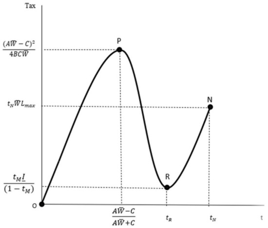 The curve is not multi-peaked but double-peaked, with one bottom point. Another peak point of the tax revenue exists at point N in Figure 5. This is due to the fact that along the region between R and N, an increase in the tax rate leads to an increase in the labor supply. Thus, revenue increases by an increasing rate. Beyond this point, an additional increase in the tax rate represents entering into the subsistence income level. Therefore, the worker disconnects himself from the labor market and prefers self-production, which enables him to survive, while also avoiding any taxation. Self-production is tax free. In such a case, the tax revenue definitely drops very significantly. This evidence justifies our claim that point N is a local peak point.