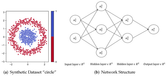 As shown in Figure 1a, the “concentric circle” data are used as a binary classification example to reveal the different role of each sample in the parameter update. It is a binary classification problem with coordinates as input and categories as output. The inner blue points are regarded as a “positive class”, and the outer red points are regarded as a “negative class”. The data are trained through a fully connected network with one input layer, two hidden layers, and one output layer. The ReLU is used as an activation function of neurons in hidden layers. We make notational conventions for the convenience of description. The four layers in Figure 1b are denoted by L1, L2, L3, and L4, respectively.
