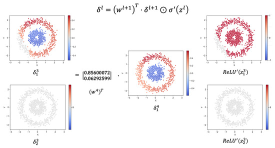 First, the “error” no longer propagates. It can be seen from Equation (4) that for the samples with 0 “errors” in this layer, their “errors” in the next layer also become 0. Consequently, their errors can no longer propagate to the next layer, exacerbating this phenomenon. We visualized each factor term in Equation (4) when passes from L4 to L3 in Figure 2.
