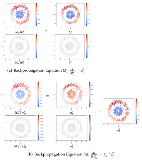Backpropagation Equation (2): the visualized factors are listed below each sub-graph. Each point means a sample, and the color represents their value. Red dots are positive, blue dots are negative, and gray dots are 0. It can be seen intuitively that because some points of are 0, part of becomes 0 through the Hadamard product. Some “errors” in cannot propagate to . In addition, node is the true dummy node. It completely hinders propagating to .