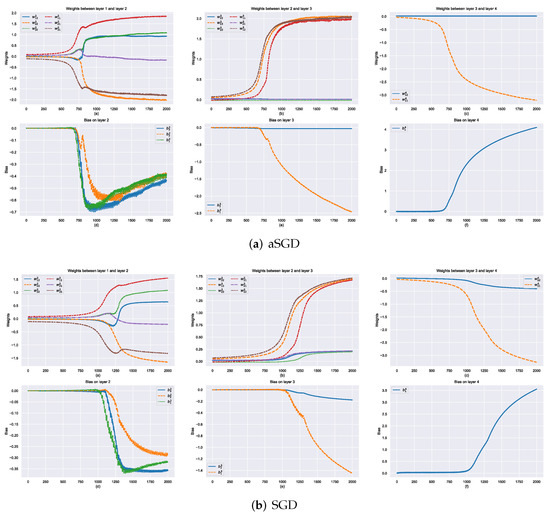 We trained the same network in the second section with aSGD and SGD, respectively. The update of parameters during the entire training process is shown in Figure 4. By comparing the variation of parameters under the two optimizers, we found two properties of aSGD.