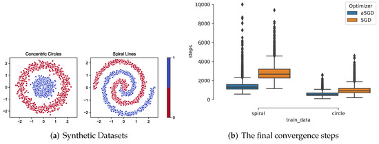 The specific design is as follows: we use a fully connected network to train two kinds of synthetic data, “concentric circles” and “spiral lines”, with SGD and aSGD, respectively. The training samples are shown in Figure 5a. There are four groups of experiments. The training data and test data are sampled in the same pattern of data, and the ratio is 7:3. Groups 1 and 3 use aSGD to train “concentric circle” and “spiral line”, respectively, while Groups 2 and 4 use SGD. The fully connected network is designed with five hidden layers, each with 10 nodes. Except for the activation function of the output node, which is sigmoid, other nodes are ReLU. Parameters are randomly initialized before each training, and 10,000 batches are trained. We stop training with minimal loss or 10,000 batches. The learning rate of Groups 1 and 2 is 0.01, and that of Groups 3 and 4 is 0.05. In total, 128 samples were input for training in the four groups, and the experiment was repeated 10,000 times.