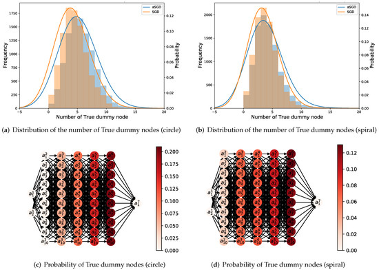 As is shown in Figure 7c,d, the closer to the output layer, the more likely it is to become a true dummy node. True dummy nodes are more likely to appear on simple datasets; its probability of appearing in the output layer is 0.2 in concentric circles and 0.12 in spiral lines. This may be because in the process of forwarding propagation, the classification results are gradually formed, and there is no need to learn more parameters. This results in a more true dummy node. The probability of nodes in the same layer is similar. This may be due to the fact that the number of nodes in each layer of the network is the same.