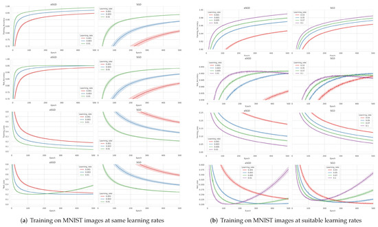 In order to explore the difference between the SGD and aSGD in terms of classification performance, we design the experiment below. The dataset is a MNIST handwritten digit dataset [36]. It contains 60,000 training images and 10,000 test images, and each image is a 28 × 28 gray-scale image. There are 10 classes corresponding to the 10 digits. A fully connected network with two hidden layers is used, and the number of nodes in each layer is 784, 30, 20, and 10. The output layer uses Softmax as the activation function, and the remaining layers still use ReLU. We set the batch size to 64, and train 500 epochs under different learning rates. In this experiment, we do not take early stopping [37] to prevent overfitting. Therefore, we can observe the performance of the two optimizers under different conditions, including underfitting and overfitting. The experiment is repeated 100 times. The learning curves in two cases are presented in Figure 8a,b respectively, one where only the optimizers are different and the hyperparameters are exactly the same, and the other where both optimizers are adjusted to a suitable learning rate.