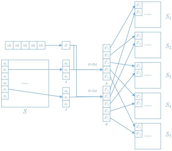 The proposed algorithm of secret image sharing based on matrix operation (ISSMO) is shown in Algorithm 3. When n = 5, k = 3, the schematic diagram of the sharing process is shown in Figure 1.