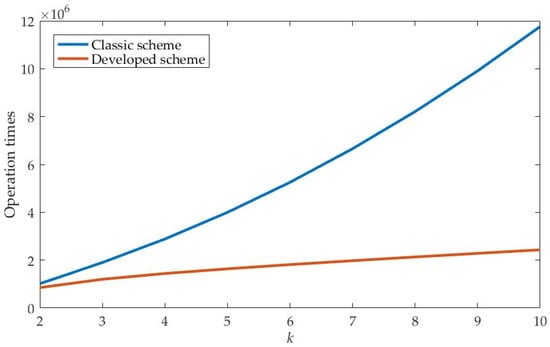 In this paper, the number of operations of the classical secret sharing scheme compared with the secret sharing scheme proposed in this paper is plotted using MATLAB 2016a. Figure 3 shows the image of the number of operations performed by the two different schemes varying with the value of k, where w = 256 × 256, n = 10, and k is taken from 2 to 10.