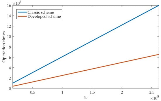 Comparison of the number of operations performed by the two schemes with respect to changes in w.