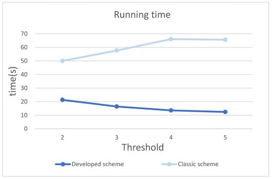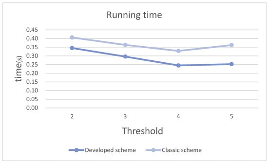 Under the finite field GF(251), the running times for threshold values of k = 2, 3, 4, 5 are recorded respectively as shown in the following Table 2, and the running time comparison graphs are shown in Figure 7.
