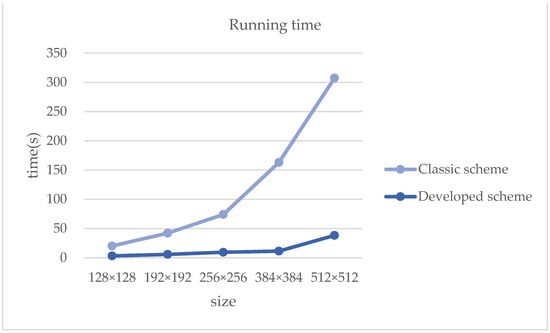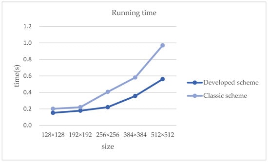 Under the finite field GF(251), the running time when the recording size is 128 × 128, 192 × 192, 256 × 256, 384 × 384, 512 × 512 is shown in the following Table 4, and the running time comparison chart is shown in Figure 9.