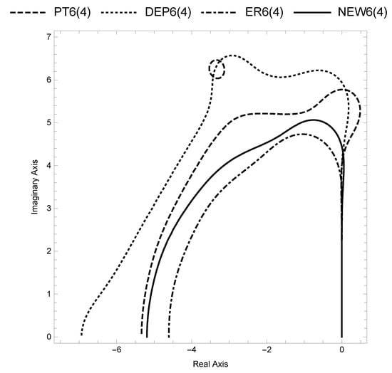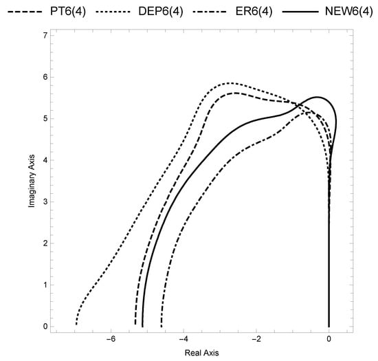 with . Thus, the RKN methods posses a couple of stability regions associated with their higher orders formulas. Namely, for y and . We may produce them requiring and . This type of stability analysis is associated to the corresponding A-stability of Runge–Kutta methods.