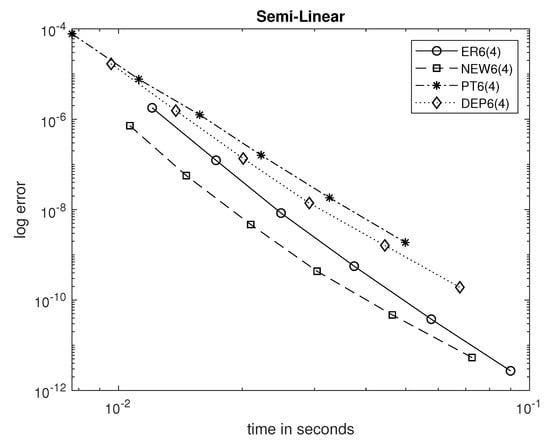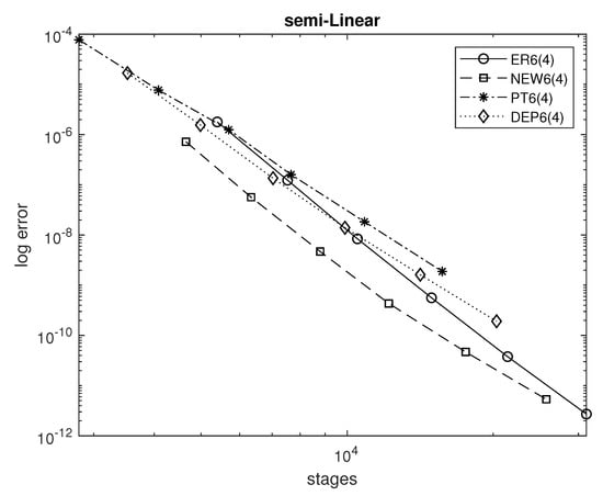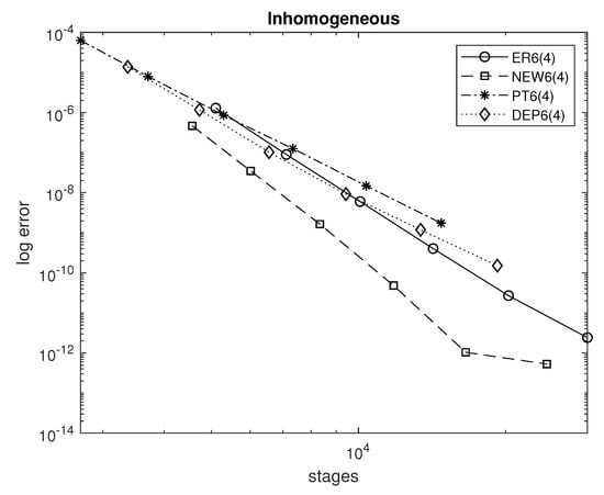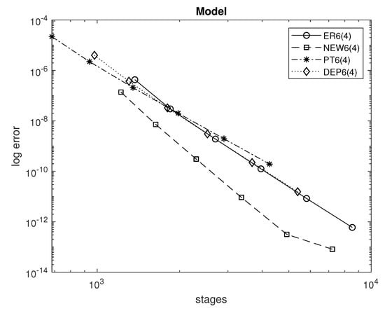 We solved the above equation in the interval for tolerances . The efficiency plot recording the stages used by the four pairs versus the maximum global errors observed over the whole grid is presented in Figure 6.