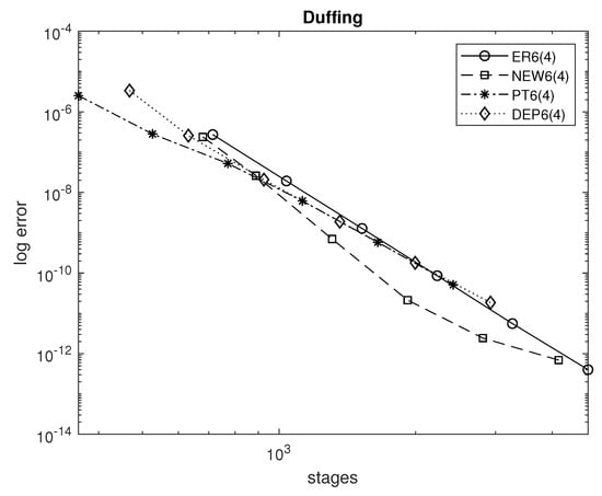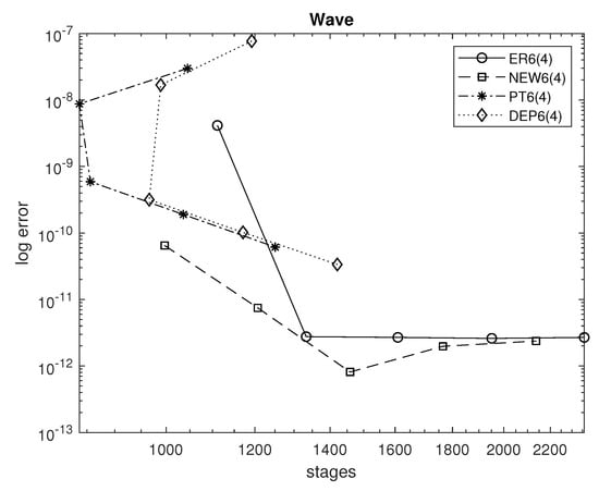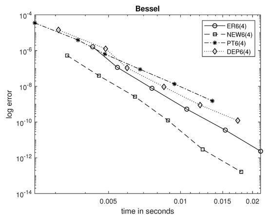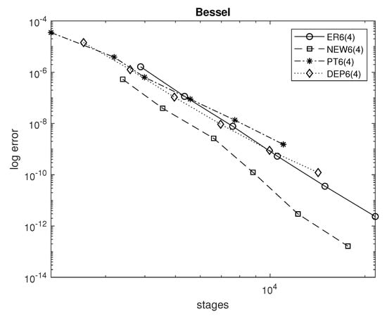 with being the zeroth order Bessel function of the first kind. We solved the above equation in the interval for tolerances . The efficiency plot recording the stages used by the four pairs versus the maximum global errors observed over the whole grid is presented in Figure 5.