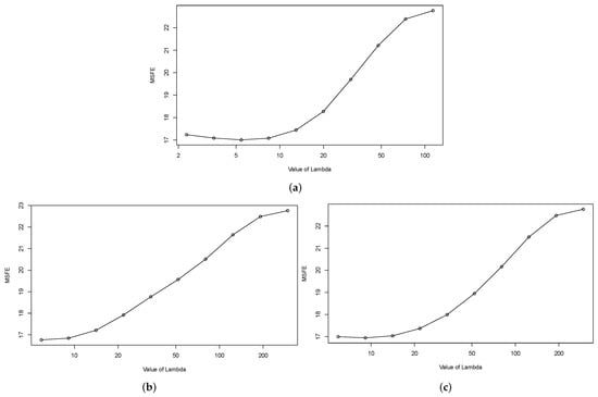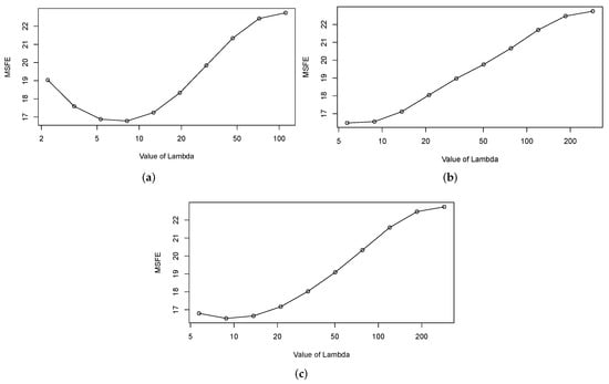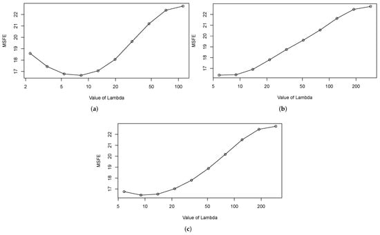 Figure 2 shows the cross-validation behavior of the different regularization alternatives. The y-axis is the MSFE and the x-axis the value of . Optimal lambdas are reached at , and .