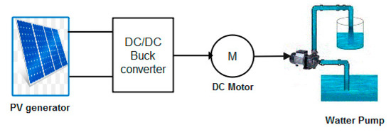 Figure 8 presents the block diagram of a photovoltaic system. This system is composed by a photovoltaic generator, direct current (DC) reducing the converter, and a DC pump motor [34].