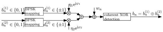 In Equation (1), are uncoded n-th BPSK symbols. and are magnitudes and phases of subchannel attenuations, respectively. Index 1 and 2 indicate the source. is the complex Gaussian noise with mean 0 and variance .