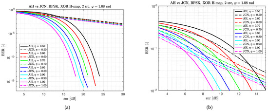 In all the figures, , , . SNR is given with regard to the first source. Rayleigh fading channel is of the form