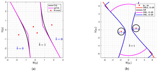 Observations follow. In Figure 5a, we see that the boundaries of decision regions of the coherent and the approximate coherent detector for SNR = 0 dB are quite close to each other. For higher SNR, boundaries are closer to each other. That results in practically the same H-BER performance of the two detectors as can be seen in Figure 6a. We can notice that the boundaries of decision regions for the approximate coherent detector consist of 4 line segments.