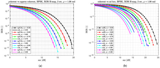 H-BER of the coherent (coh) vs. the approximate coherent (apCoh) detector (a) and the coherent vs. ad hoc (adH) detector (b). (a) H-BER of coherent vs. the approximate coherent detector. (b) H-BER of coherent vs. ad hoc differential detector.