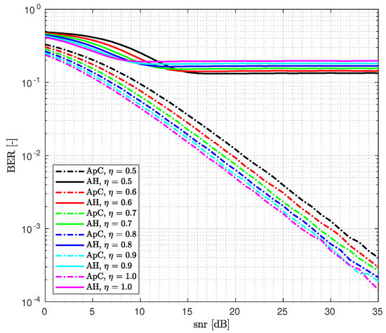 In Figure 7, we compare the ApC and AH detector for the Rayleigh channel. The AH detector knows only the channel parameter , as given in the system model (57). We see that the knowledge of the magnitudes of subchannel attenuations for the AH detector is crucial and its absence results in very poor error performance. The ApC detector uses full knowledge of the channel parameters and .