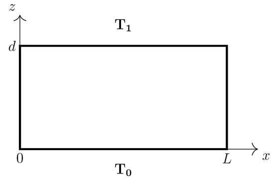 A two-dimensional fluid layer is contained in a rectangle of depth d and length L (see Figure 1). At the lower solid plate, a temperature is considered, and at the upper non-deformable free surface, the temperature is . Then, the temperature difference between both plates is . The lateral boundaries are impenetrable, non-deformable, and exhibit zero heat-flux. In a Cartesian coordinate system, the horizontal and vertical coordinates x and z, the time t, and the velocity , the pressure P, and the temperature fields are adimensionalized, according to Ref. [46], , , , , , and , where primes denote dimensionless quantities, is the density of the fluid at temperature , k is the constant thermal diffusivity, and is the constant viscosity. Dropping primes, the dimensionless velocity, temperature, and pressure fields satisfy the following equations: