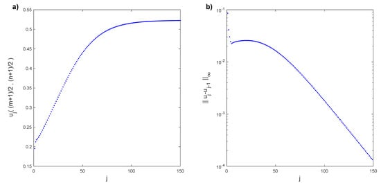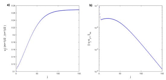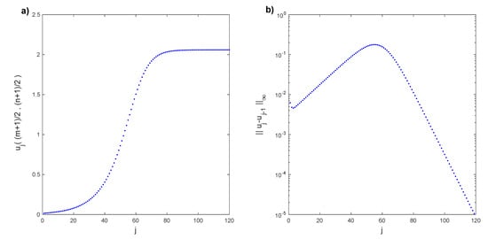 Now, the presented reduced-order method is applied to calculate a second bifurcation point. The following numerical results were obtained with a grid of Legendre–Gauss–Lobatto nodes. First, we follow Algorithm 1 for the value of the Rayleigh number . We solve the linear stability analysis Problem (12)–(14) with bc (9) and (10) for the conductive solution, , with a Legendre collocation method. A linear combination of the two eigenfunctions corresponding to the eigenvalues with the largest real part is the initial condition to obtain the steady solution with the time evolution discretization. This procedure generates some transitory numerical states before convergence . We are taking the transitory states such that . A total of 64 transitory states meet this condition. The first 13 are disregarded. Half of the remaining states have been taken, namely, the even ones. Then, . In Figure 13a, the horizontal component of the velocity in the middle of the cell , depending on the transitory time step, is plotted. We observe that the transitory states converge to the solution . In Figure 13b, the infinity norm of the difference between two consecutive transitory states of the horizontal component of the velocity field is displayed. As expected, these differences tend to zero. Isotherms of the transitory states at temporal steps , and can be seen in Figure 14. The exhibited transitory states are far from the converged solution.