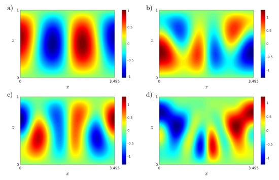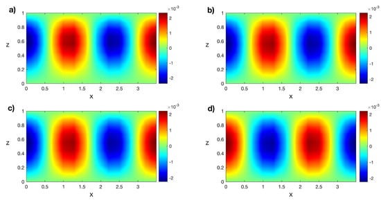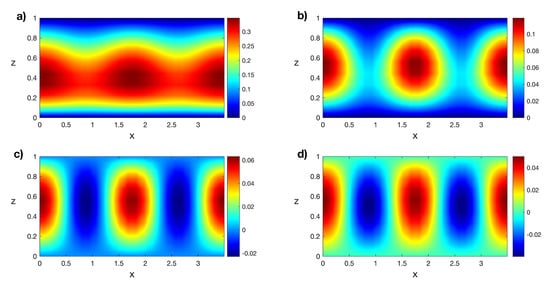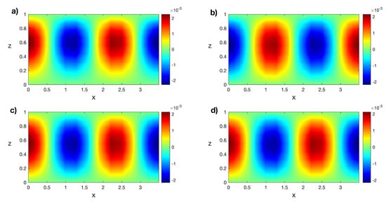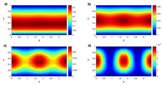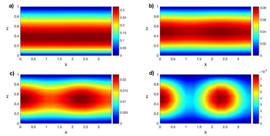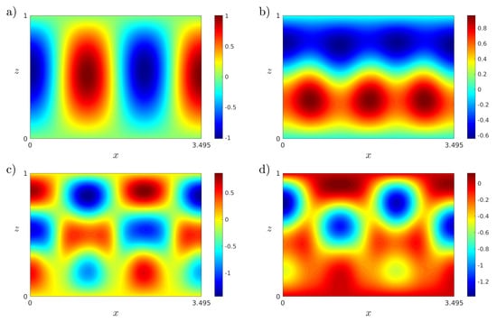 Isotherms of the first eigenfunctions of the transitory states for at (a) , (b) , (c) , and (d) . Results obtained with a spatial numerical grid of Legendre–Gauss–Lobatto nodes.