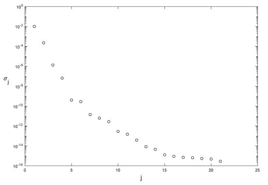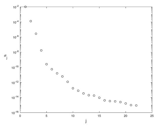 These snapshots construct, in columns, the corresponding snapshot matrices, , for the first and the second components of the velocity field, the temperature, and the pressure fields, , and , whose columns are the velocity, temperature, and pressure snapshots, respectively. Once these matrices are obtained, we proceed to calculate the modified snapshot matrices , and in terms of the snapshots, as is defined in Algorithm 2 below. These matrices are not the usual correlation matrices used in other works, and it has been proved they are more efficient [46]. We obtain the singular values , and the corresponding eigenvectors , of the modified snapshot matrices. If the singular values decay quickly to zero, this means that the model reduction approach will be worth implementing.