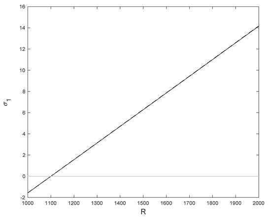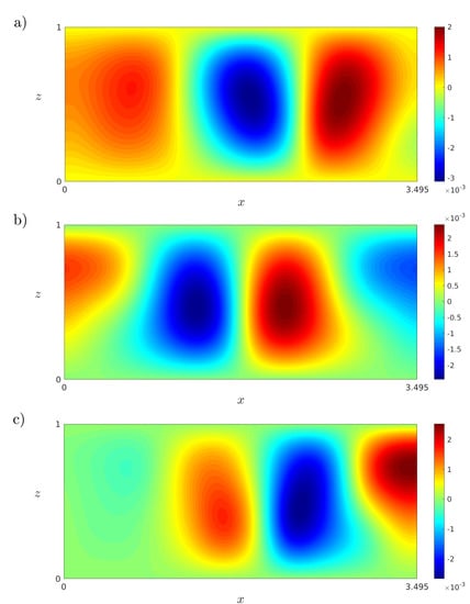 The eigenvalues and their corresponding eigenfunctions depend on the stationary solution and, therefore, on the Rayleigh number R. We denote as the largest real part of all the eigenvalues . To determine the stability of the stationary solution, we study the sign of . If , the stationary solution is stable. If , the solution is unstable. In this context, we first name the eigenfunction of the stationary solution the eigenfunction related to .