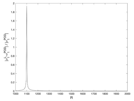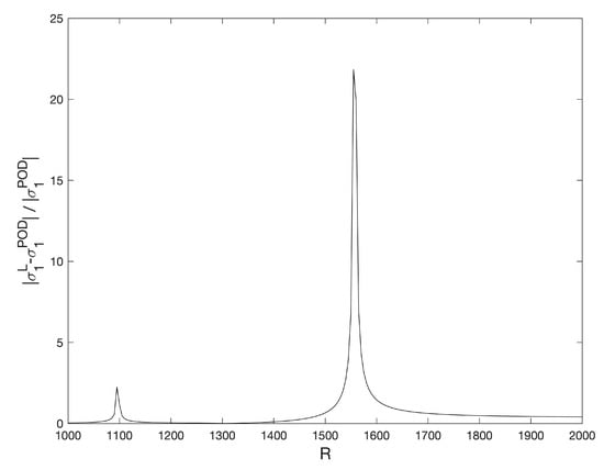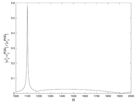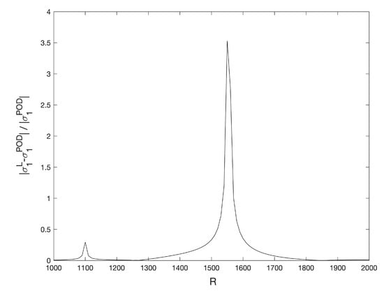 Now, we solve Problem (6)–(10) for values of the Rayleigh number in the interval with the POD/Galerkin method and with Legendre collocation. For instance, the isotherms and the velocity field of the POD solution for can be seen in Figure 26a. The same solution, obtained with Legendre collocation, is shown in Figure 26b, as in Ref. [50]. The norm of the difference between both solutions is order . Then, we solve the Galerkin/POD linear stability Problem (17) and (18) for . The first eigenfunction of the solution , computed with the POD method, can be seen in Figure 8c. The norm of the horizontal component of the velocity field for this solution in the interval can be seen in Figure 27a; the continuous line has been obtained with Legendre collocation and the dashed line with POD. The difference between both solutions is order . Finally, the POD method is applied to perform the linear stability analysis. The corresponding plot of can be seen in Figure 27b; the continuous line has been obtained with Legendre collocation and the dashed line with POD. The relative difference between both values of is plotted in Figure 28; it is order , except at the bifurcation points and , where we divide by a value near zero. The computed eigenvalue shown in Figure 27b, , corresponds to the stability of in the interval , the stability of in the interval , and the stability of in the interval . As we already calculated, is stable for values of and unstable for . At , solution appears from . These solutions are unstable in the interval because is positive in this interval for these solutions and it is stable for , as can be seen in Figure 19b. Solution emerges from at . These solutions are unstable for because is positive there. These results coincide with those in Ref. [50].