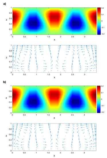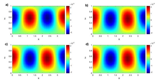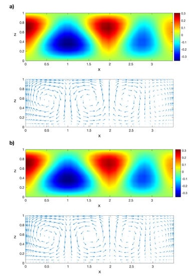 Equations (1)–(3) are the continuity, momentum, and energy conservation equations, in which the Boussinesq approximation is considered in order to simplify the problem, as in Refs. [46,50]. Problem (1)–(5) has a simple conductive solution , , and . The Prandtl number is considered infinite, as in geophysical models of Refs. [50,52,53]; then, the left-hand side of Equation (2) is neglected. Rescaling the problem, as in Ref. [46], and , and dropping the primes, Problem (1)–(5) is rewritten as follows:
