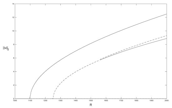 Bifurcation diagram in which the norm of u, , is shown versus R, . The critical Rayleigh numbers (first supercritical pitchfork bifurcation), (secondary bifurcation), and (subcritical pitchfork bifurcation) are captured. Solid line represents stable solutions. Dashed line represents unstable solutions.