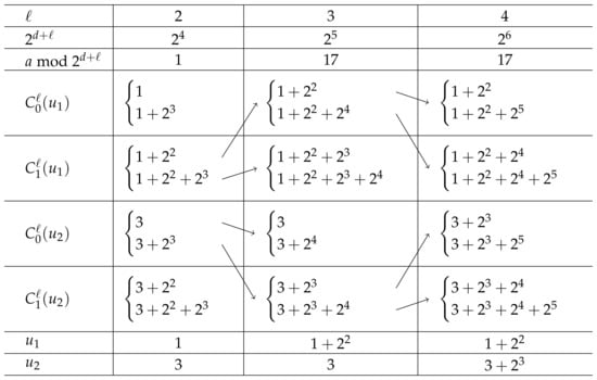 As , the congruence has solutions in . These solutions can be obtained as shown by Lemma 2. They can be lifted to and by the procedure shown in the proof of Theorem 2. The process is illustrated in Figure 1.