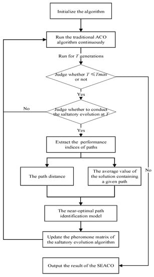 With other variables unchanged, run the traditional ACO algorithm using the updated pheromone matrix according to step 2. If the number of iterations T reaches , the near-optimal solution of the last iteration will be output. Otherwise, judge whether T reaches the starting generation of saltatory evolution. If yes, repeat step 3. If not, go to step 2.