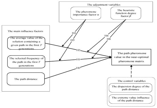 Next, the quantitative analysis model will be used to test hypotheses, which is to mine the near-optimal path prediction rules from the pheromone matrix evolution data of the traditional ACO algorithm. First of all, each path pheromone in the near-optimal pheromone matrix is set as an explanatory variable Y, which describes the path performance, and then, three key assumptions that could affect the path pheromone in the near-optimal pheromone matrix are proposed based on the path performance evaluation indexes.