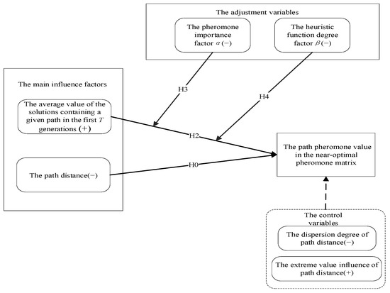 It can be seen from Formula (2) that the pheromone importance factor α and the important factor of heuristic function β in the ACO algorithm affect the value of the path selection probability. Therefore, in the hypothesis test model, α and β are defined as the adjustment variables for the average value of the path solution and the frequency of path selection. The following four hypotheses are proposed based on the above algorithm mechanism: