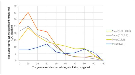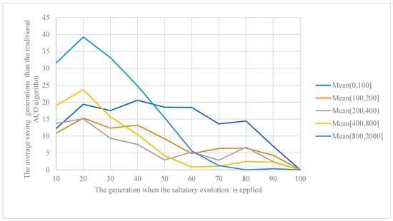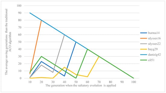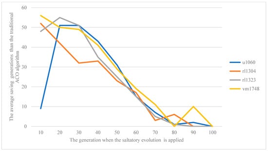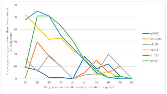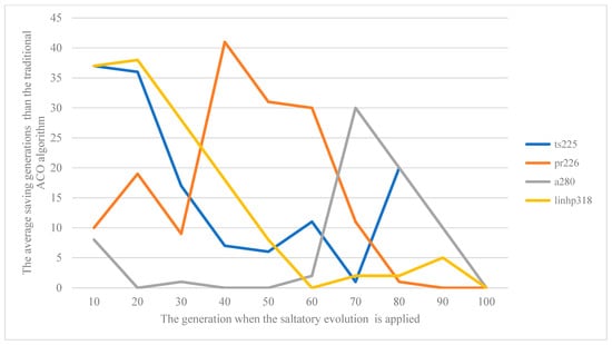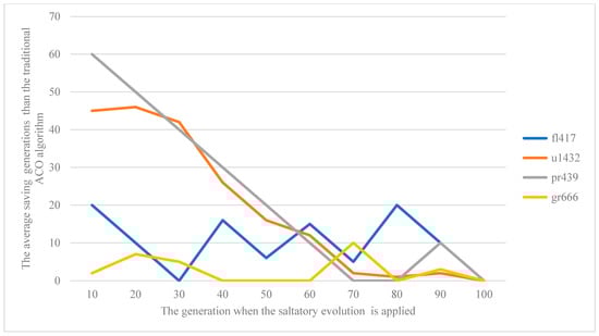 Next, the experiment was run on 24 test data sets, which were randomly selected from the TSPLIB database, and these data sets were broadly representative because their city numbers ranged from 100 to 1379. The running time was compared when the SEACO algorithm and the traditional ACO algorithm got the same result. For example, if the near-optimal solution of the SEACO algorithm at the Tth generation is smaller than or equal to the near-optimal solution of the traditional ACO algorithm at the (T + t)th generation, it means that the SEACO algorithm saves t generations of running time than the traditional ACO algorithm. The experiment was applied on Matlab R2017b software with i7 Intel processor and 32GB internal storage. Based on the parameters of traditional ACO and other improved ACO algorithm [21,22,23], the following parameters of the SEACO algorithm were set. The number of ants m was 200; the pheromone importance factor α was 1; the heuristic function important factor β was 5; the pheromone volatilization factor ρ was 0.1, and the constant variable Q was 1. The SEACO algorithm was conducted with pheromone matrix updated at the 10th, 20th, 30th, 40th, 50th, 60th, 70th, 80th, 90th, and 100th generation of the traditional ACO algorithm, and continue running 3 generations after each update to find the best solution. The consumed generations for achieving the same solution are compared between the SEACO algorithm and the traditional ACO. The complete comparison results are shown in Table 4, and Figure 4 displays the data sets with the largest improvement in different injected generations.