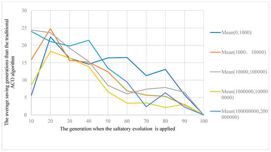 As shown in Figure 5, Figure 6, Figure 7, Figure 8 and Figure 9, the optimization ability of the SEACO algorithm presents a decreased trend with the delay of injection time on all city-scale data sets, which means it can slightly improve the optimization speed when injected in the earlier running stage. As shown in Figure 10, the SEACO algorithm reflects better performance on the larger scale data sets than the smaller one in general. Specifically, the SEACO algorithm performs best in the data sets where the city number is within (800, 2000], and nearly 40 generations on average can be saved when injected at the 20th generation. This means that the SEACO algorithm can significantly improve the optimization speed of the large-scale TSP.