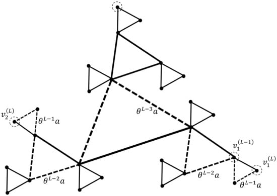 Then and , that is, the separation number of the vertex of ( rank is less than the separation number of the vertex of rank: . Thus, no vertex of rank that is incident with new edges of rank can be the center of the prefractal graph.
