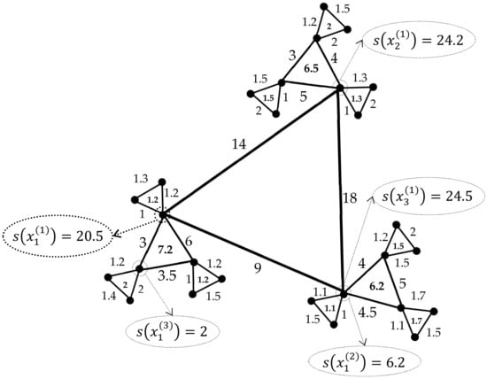 In Equations (7) and (8), the entries and denote functions of the weight and topological characteristics, respectively. In individual problems, the number of criteria is specified. In this case, sets of weights are considered to be incomparable and of a different nature. If we assume that sets are of the same type and it is possible to perform arithmetic operations on them, then sets of weights can be replaced by a single weight. For example, you can use the mean or well-known linear convolution methods and solve the problem with one set of weights.