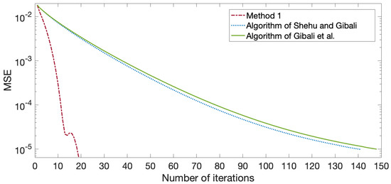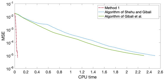 Table 1 and Table 2 show that Method 1 had less iteration, CPU time, and lower objective function and MSE values than those of the algorithm of Shehu and Gibali [25], and the algorithm of Gibali et al. [22] for different m-sparse. This reveals that our algorithm had better convergence than that of other methods.