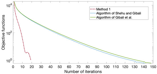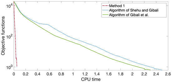 In the algorithm of Gibali et al. [22], and the algorithm of Shehu and Gibali [25], we choose , . In Method 1, defined by a fast iterative shrinkage-thresholding algorithm (FISTA) [31]. Choose , , and set