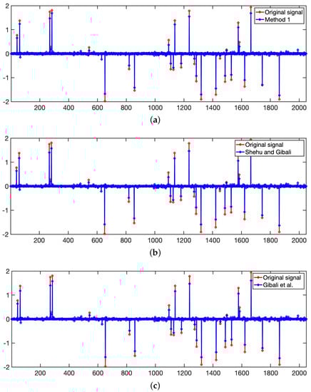 Original signal and recovered signal by Method 1, algorithm of Shehu and Gibali and algorithm of Gibali et al., respectively, when , , and . (a) Recovered signal by Method 1. (b) Recovered signal by the algorithm of Shehu and Gibali. (c) Recovered signal by the algorithm of Gibali et al.