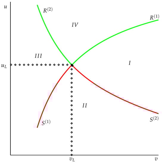 The curves (60), (61) characterise in the plane all the right initial states which allow us to solve the GRP (53), (54) by a shock or by a shock. It is relevant to notice that both the generalised rarefaction curves (51) and (52) as well the shock curves (60) and (61) involve the limiting values of the initial data for (i.e., , , , ). Therefore, such a curves coincide with those of the RP for the p-system (see []). It follows that the general discussion of the solution of the RP for the p-system is useful here for characterising the general solution of the GRP given in (53), (54). In fact, by referring to Figure 1, if belongs to one of the curves , , then the solution is given in terms of the non-constant states (55) and (56) separated, respectively, by the generalised rarefaction wave (46), (47) or by a shock wave (shock or shock). If, on the other hand, belongs to one of the regions I, , or , then, as in the case of the RP, the solution of (53) and (54) is determined in terms of three non-constant states separated by generalised rarefaction waves and/or shock waves (the interested reader can find a detailed discussion corresponding to the RP in []). Finally, taking (59) into account, we notice that, for large t, both the shocks or the shocks tend to a stationary shock.