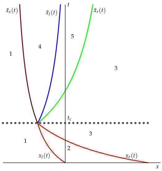 In the following, we consider the case characterised by (71). Of course, similar results can be obtained in the remaining case. Since the solution (67)–(70) is regular until , we have now to study the following GRP: