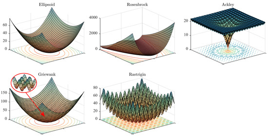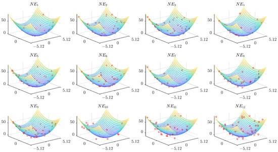 The landscape of the benchmark functions is shown in Figure 4 for the analysis. When analyzing the effect of noise level on the performance of the algorithm, some special phenomena can be found. When we tested different benchmark functions, the impact of the NES on the algorithm was significantly different. This difference was reflected in the value of the optimization results, as well as in the number of noise levels whose optimization results significantly differed from the results obtained in the IES. Taking DDEA-SE as an example, the related results are shown as Table 3.