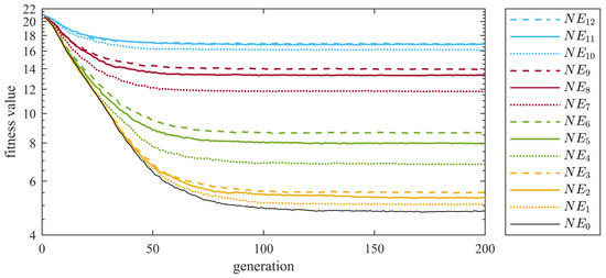 Detailed results are shown in Appendix A. Table A1, Table A2, Table A3, Table A4, Table A5, Table A6, Table A7, Table A8, Table A9 and Table A10 show the real fitness value and the value of the final solution obtained by the four test algorithms, respectively. We utilized the Wilcoxon rank-sum test to determine whether the results obtained in NES were significantly different from the results obtained in IES. The hypothesis was that the overall distributions of the results obtained in IES and in NES of a certain noisy level would be the same. If the rank-sum test result was smaller than the significant level 0.05, the hypothesis would be rejected. Meanwhile, the of results that significantly differ from the results obtained in IES are shown in bold in Table A1, Table A2, Table A3, Table A4, Table A5, Table A6, Table A7, Table A8, Table A9 and Table A10. When comparing the optimization results of four algorithms in NES, the Friedman’s test with a significance level of 0.05 was adopted. The Friedman’s test result value is shown in Table A1, Table A2, Table A3, Table A4, Table A5, Table A6, Table A7, Table A8, Table A9 and Table A10.