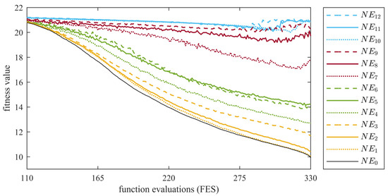 We tested four selected algorithms on five benchmark problems under 12 levels of NES. Because the fitness function used in the optimization process is noisy, we needed to evaluate the non-noisy fitness value of the optimal solution as the experimental results of DDEAs. In addition, the optimization results of DDEAs on five benchmark functions in the IES were considered as the results of the blank experiments. Each experiment was repeated 30 times, and the mean and standard deviation of the fitness value were recorded.