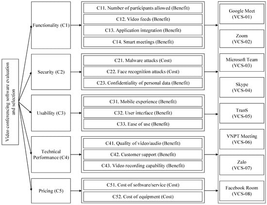 The alternatives are evaluated with respect to 4 main dimensions and 15 criteria, as shown in Table 4. The hierarchical tree for the evaluation of the video conferencing software is presented in Figure 3. For the evaluation of criteria and alternatives, software specialists and experts were invited and requested to give their opinions. A panel of 15 experts with professional experience with respect to software and business experience was asked, and by identifying alternative measures and critical evaluation criteria, the results were made as objective as possible. Many vital considerations such as consumer behaviors, tools or support teams to integrate products with a business, or many more market-related matters were referenced and discussed between experts and specialists to determine critical factors for evaluating and selecting alternatives for businesses. After discussions, the evaluation indicator system was constructed and finalized as the suitable and comprehensive set of criteria responsible for the feasible implementation of the VCS from a developing country’s perspective.